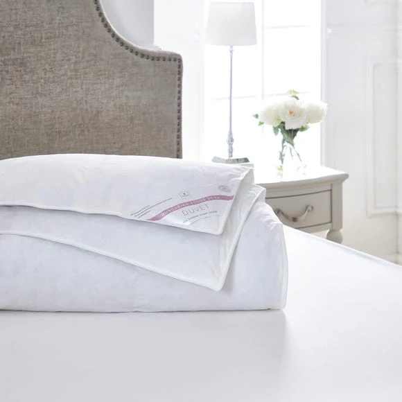 Enjoy a cosy night’s sleep during those in between seasons thanks to Dorma’s 7.5 tog duvet filled with top quality 70% Hungarian goose down and 30% feather. Hungarian Goose Down is known for its outstanding softness and insulating properties which help to prevent drafts and cold spots to keep you perfectly warm at night. Covered in a sumptuous, crisp 100% cotton jacquard, this premium 300 thread count duvet is available in a choice of sizes and is machine washable and tumble dryer safe for your convenience. Made in the UK.