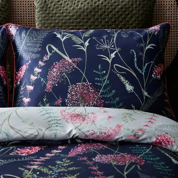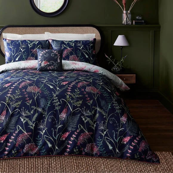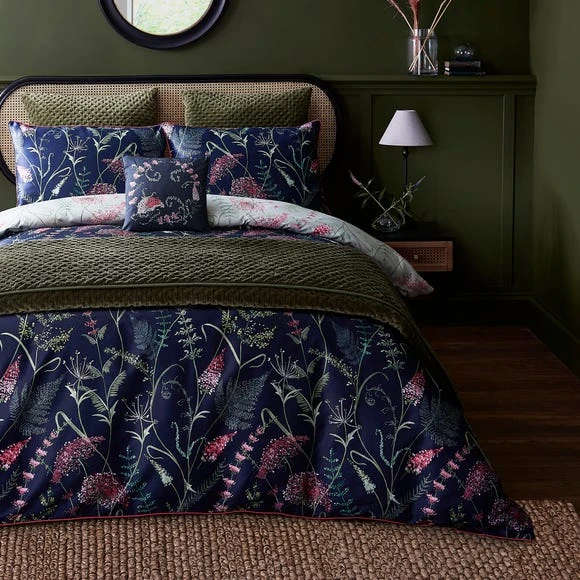 Featuring hand-painted floral sprays this bedding set is adorned with a winter botanical design in a striking seasonal colour palette accented by sumptuous forest green and intricately embroidered accessories. Printed on high-quality 300 thread count cotton sateen this bedding set adds lustre and elegance to your bedroom. Extra pillowcases and coordinating curtains are also available.