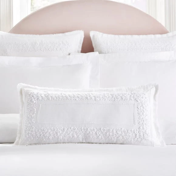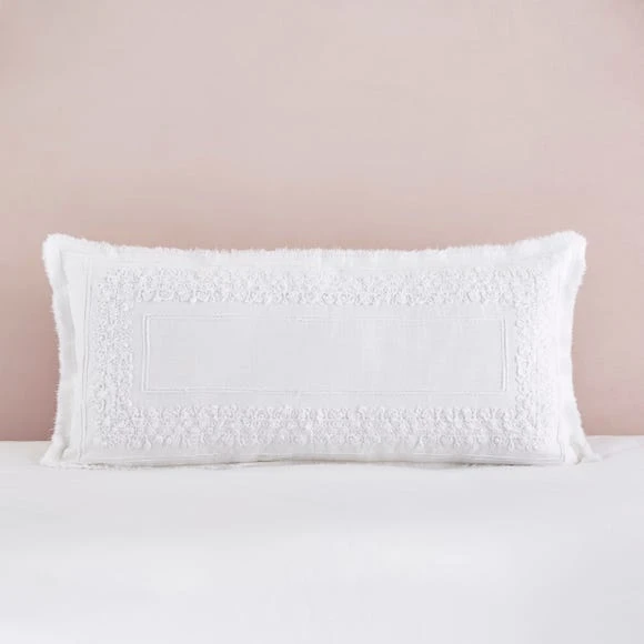 A beautiful combination of embroidered embellishments, lightly frayed trims and a delightfully crisp, white colourway give this long boudoir cushion its elegant look. The Dorma Burley embroidered cushion has a handmade, global artisan feel that’s luxurious yet casual. Complete the look by pairing this cushion with the coordinating embroidered cushion and continental pillowcase available.