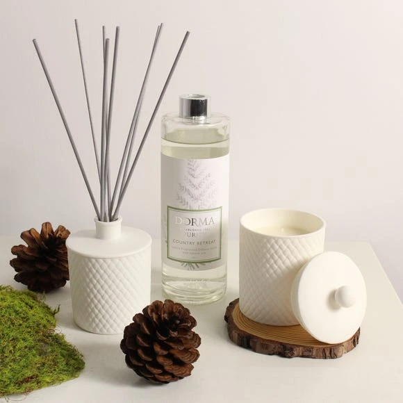 Part of the Dorma Purity range, this luxury fragranced candle has been developed by expert perfumers using only the finest natural oils and blended with soy wax. This fragrance bursts with refreshing pine, rich cedar and earthy moss. Enchanted with notes of red berries, thyme and patchouli in the backdrop, it has a burn time of up to 40 hours. Each candle is beautifully packaged and contained within its own white porcelain lidded jar, featuring an exquisite cane embossed pattern which can be kept and reused as a decorative object, making this luxury candle truly unique.